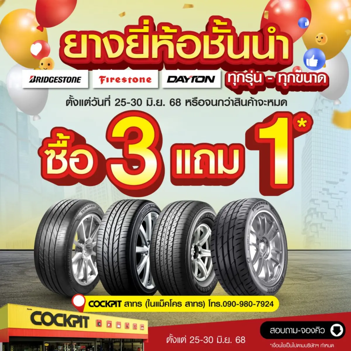 Buy 3 tires of any participating models and sizes from BRIDGESTONE, FIRESTONE or DAYTON, get 1 tire free. It is also packed with a wide range of car care products. Special offer! Customers who register at the Grand Opening event on 28 June 2025 will have a chance to win a free tire replacement, buy 2 tires, get 2 free, limited to 30 lucky winners. There will also be activities to win many prizes throughout the event.