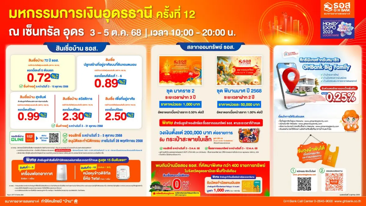 ธนาคารอาคารสงเคราะห์ (ธอส.) ชวนชาวอีสานรับโปรโมชันสุดคุ้มงาน “มหกรรมการเงินอุดรธานี ครั้งที่ 12 MONEY EXPO 2025 UDONTHANI” นำโดยสินเชื่อบ้าน 72 ปี ธอส. ดอกเบี้ยพิเศษ 6 เดือนแรก 0.72% ต่อปี สลากออมทรัพย์ ธอส. ลุ้นโชครางวัลใหญ่สูงสุด 3 ล้านบาท และบ้านมือสองกว่า 400 รายการ ลดราคาสูงสุด 50% พร้อมของที่ระลึกภายในงานมากมาย พบกันวันที่ 3 – 5 ตุลาคม 2568 ณ เซ็นทรัล อุดร