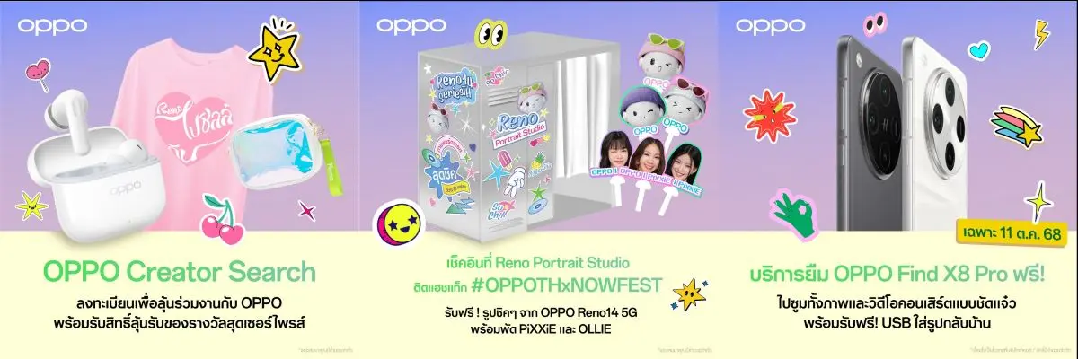 OPPO แบรนด์เทคโนโลยีชั้นนำประกาศจับมือเป็นกับ NOW FEST 2025 เทศกาลดนตรีสุดยิ่งใหญ่ที่ชาว Gen Z สุดชิคที่ชื่นชอบเสียงเพลง ครั้งนี้อัดแน่นไปด้วยกิจกรรมจากบูธของ OPPO ชวนเสริมความชิคสุดคูลจาก OPPO Reno14 Series 5G ที่จะมาเติมเต็มบันทึกทุกโมเมนต์ให้พิเศษในงานนี้!