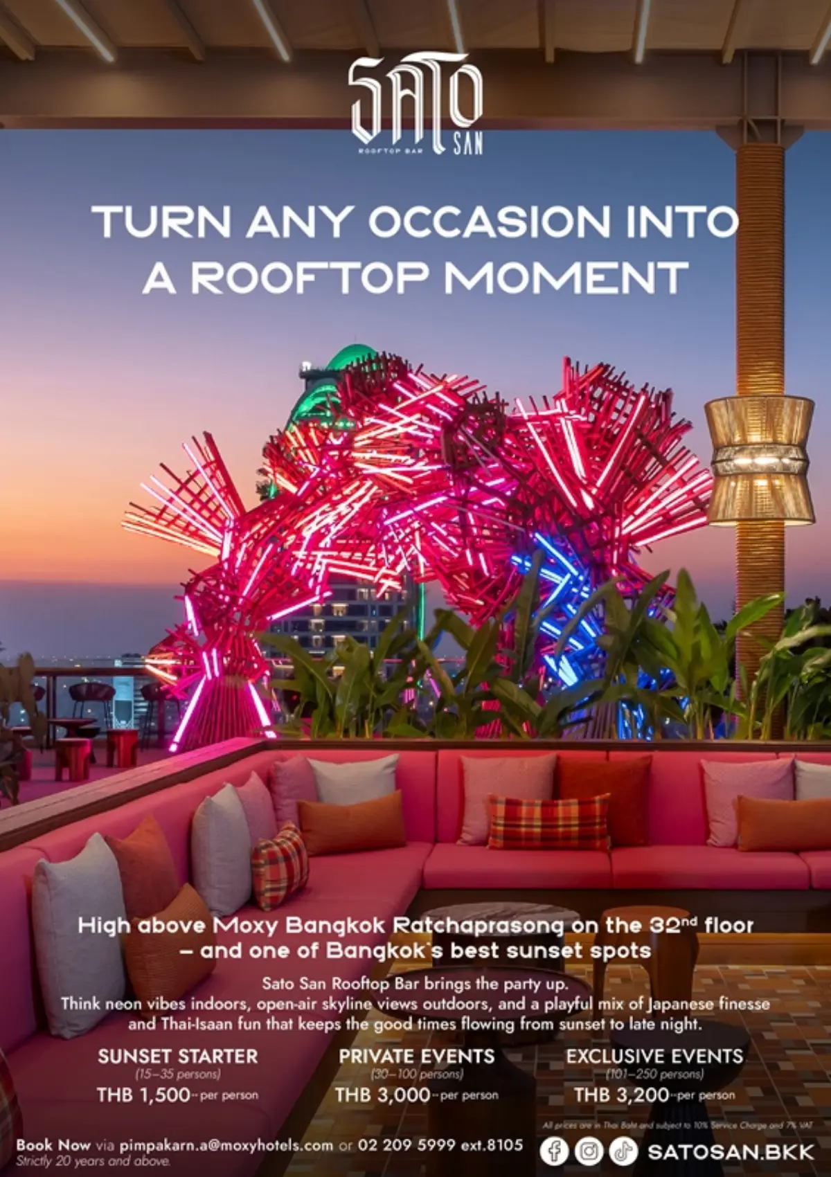 For other enquiries, private events, or exclusive rooftop events, please contact moxy.bkkox.rsvn@moxyhotels.com, call +66 2 209 5999, or visit www.marriott.com/bkkox. Culinary updates are available at www.satosanrooftopbar.com and www.moxybarandrestaurantbangkok.com, via LINE @MoxyBangkok. For direct rooftop enquiries, email moxy.bkkox.satosan@moxyhotels.com and follow social channels @satosan.bkk.