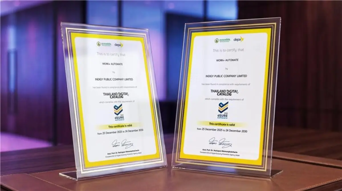ในยุคที่องค์กรไทยเร่งเดินหน้า Digital Transformation การเลือกใช้ซอฟต์แวร์ที่ได้มาตรฐานและเชื่อถือได้กลายเป็นปัจจัยสำคัญ ล่าสุด INDIGY (IDG) ผู้นำด้านโซลูชันดิจิทัล และ Workflow Automation ของไทย ได้ตอกย้ำศักยภาพอีกขั้น ด้วยการรับรอง บัญชีบริการดิจิทัล (dSURE) ระดับ 2 ดาว จากสำนักงานส่งเสริมเศรษฐกิจดิจิทัล (depa) ของ Platform WORK+ SUPERAPP และ WORK+ AUTOMATE