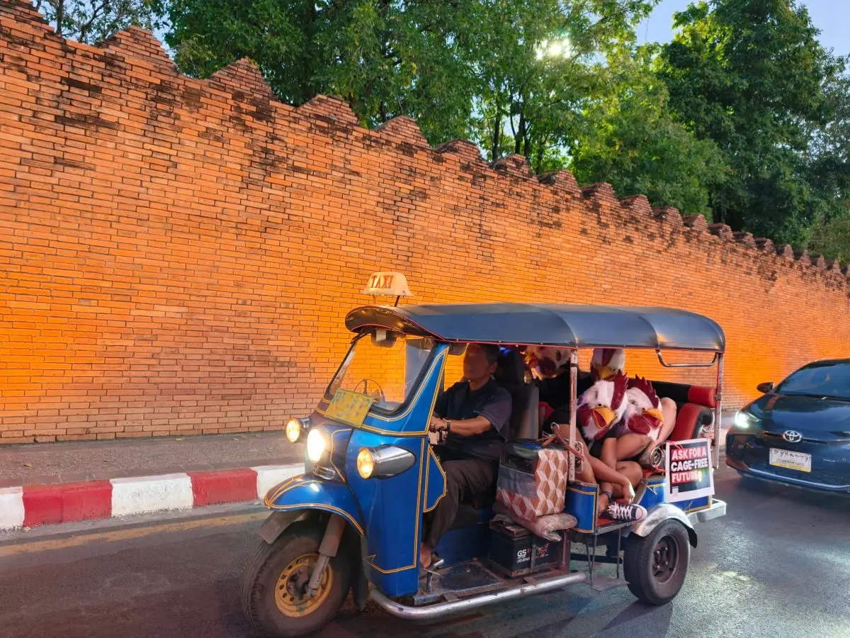 - Tuk-tuk Campaigning: Donning their chicken headgear, the activists squeezed themselves into a tuk-tuk during the evening rush hour, representing the harsh and crowded conditions egg-laying hens face in a battery cage environment.