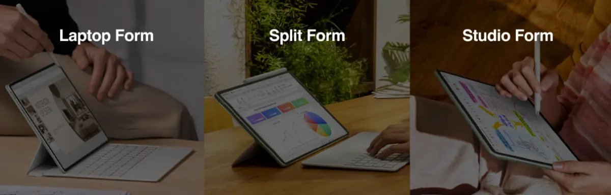 หนึ่งในจุดเด่นสำคัญของรุ่นนี้คือความสามารถในการปรับเปลี่ยนรูปแบบการใช้งานได้อย่างยืดหยุ่นตามลักษณะงาน โดยในโหมด Laptop Form คีย์บอร์ดจะเชื่อมต่อแบบติดกับตัวเครื่องในลักษณะเดียวกับแล็ปท็อป ให้ประสบการณ์การพิมพ์ที่มั่นคงและเป็นทางการ เหมาะสำหรับการจัดทำเอกสาร งานรายงาน หรือการทำงานเชิงธุรกิจ ขณะที่ Split Form เปิดโอกาสให้แยกตัวเครื่องออกจากคีย์บอร์ดอย่างอิสระ ผู้ใช้สามารถวางหน้าจอในมุมที่ต้องการ พร้อมจัดวางคีย์บอร์ดตามระยะที่ถนัด เหมาะสำหรับการจดบันทึก อ่านเอกสาร หรือทำงานหลายหน้าต่างพร้อมกัน และใน Studio Form ตัวเครื่องสามารถปรับองศาเพื่อรองรับการวาดหรือออกแบบร่วมกับปากกา M-Pencil 3 ได้อย่างเป็นธรรมชาติ ตอบโจทย์สาย ครีเอทีฟที่ต้องการพื้นที่สร้างสรรค์แบบมืออาชีพ
