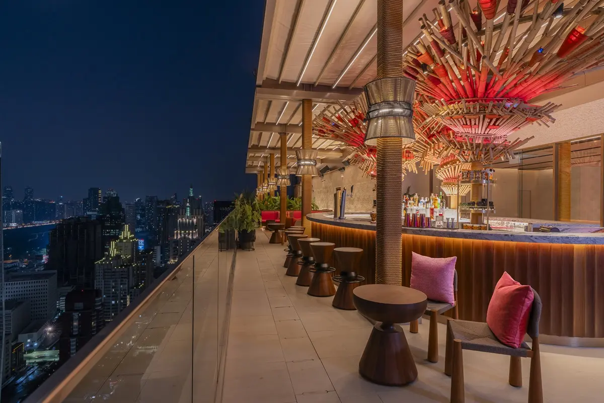 Perched on the 32nd floor, Sato San Rooftop Bar offers stunning sunset-to-night views of the Bangkok skyline, blending vibrant rooftop energy with bold flavors and a lively atmosphere above the city.