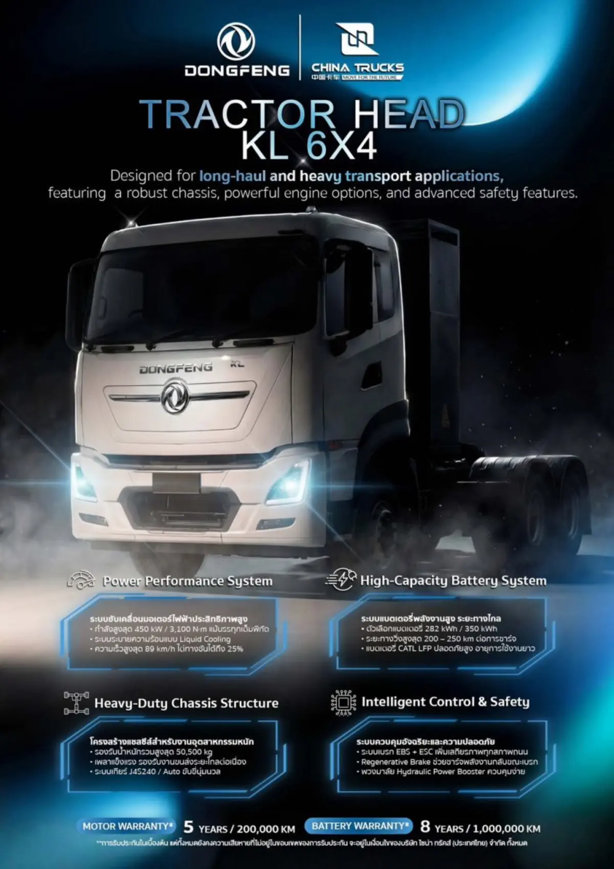 TRACTOR HEAD KL6X4 รถบรรทุกไฟฟ้ารุ่นใหม่ที่เปิดตัวในวันนี้ ยังมาพร้อมการรับประกัน Motor Warranty 5 ปี หรือ 200,000 กิโลเมตร แล้วแต่ระยะใดถึงก่อน และ Battery Warranty 8 ปี หรือ 1,000,000 กิโลเมตร แล้วแต่ระยะใดถึงก่อน