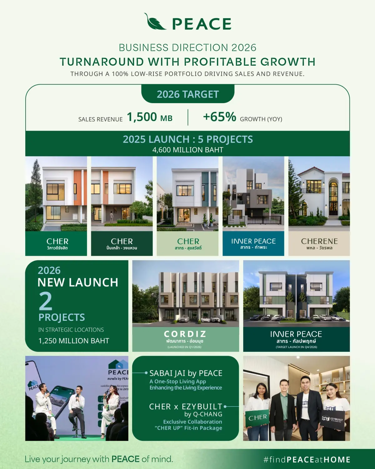 พีซแอนด์ลีฟวิ่ง (PEACE) เผยทิศทางการดำเนินธุรกิจปี 2569 ภายใต้แนวคิด “TURNAROUND WITH PROFITABLE GROWTH” มั่นใจจุดแข็งมุ่งขับเคลื่อนองค์กรสู่การเติบโตอย่างมั่นคงและยั่งยืน ผ่านความเชี่ยวชาญในการพัฒนาโครงการที่อยู่อาศัยแนวราบ ทั้งบ้านเดี่ยว บ้านแฝด และทาวน์โฮม พร้อมเดินหน้าเสริมความแข็งแกร่งของพอร์ตแบรนด์ให้ครอบคลุมยิ่งขึ้น ด้วยการเพิ่มแบรนด์น้องใหม่ “INNER PEACE” (อินเนอร์ พีซ) เพื่อให้ครอบคลุมความต้องการของลูกค้าในทุกเซกเมนต์ ตั้งเป้ายอดขายปี 2569 ที่ 1,500 ล้านบาท หรือเติบโต 65% จากปีก่อน ลุยเปิด 2 โครงการใหม่ ใกล้รถไฟฟ้า เดินทางสะดวก สะท้อนความมั่นใจในศักยภาพของธุรกิจที่พัฒนาโครงการแนวราบ 100% พร้อมยกระดับประสบการณ์การอยู่อาศัยผ่านแอปพลิเคชันที่พัฒนาขึ้นภายใต้แบรนด์ PEACE และเดินหน้าขับเคลื่อนธุรกิจภายใต้แนวคิด ESG เพื่อสร้างการเติบโตอย่างมั่นคงและยั่งยืนในทุกมิติ
