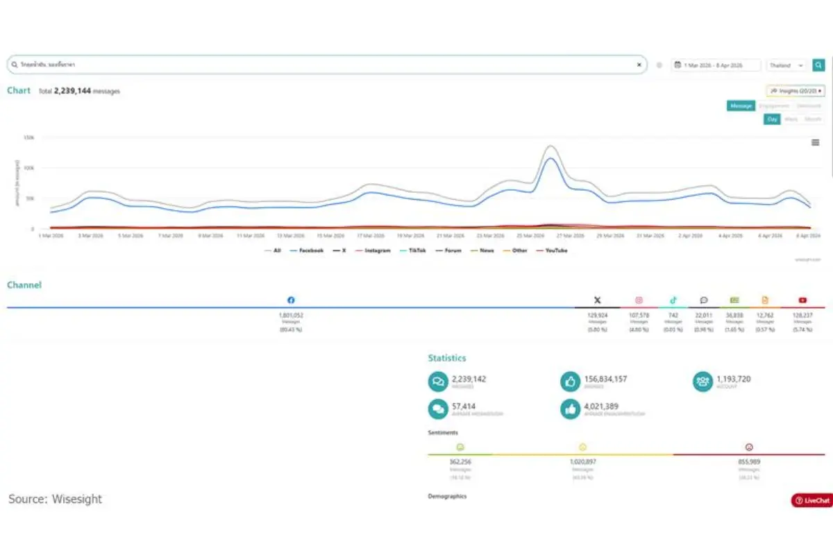 จากการติดตามข้อมูลของ Wisesight ในช่วงเดือนที่ผ่านมา ปริมาณการพูดถึงคีย์เวิร์ด “วิกฤตน้ำมัน” และ “สินค้าขึ้นราคา” มีมากกว่า 2.2 ล้านข้อความ (เฉลี่ย 57,000 ข้อความต่อวัน) และสร้าง Engagement สูงกว่า 156 ล้านครั้ง โดยกว่า 40% เป็นความคิดเห็นเชิงลบ สะท้อนถึงความกังวลด้านค่าครองชีพที่ขยายตัวในวงกว้างอย่างมีนัยสำคัญ