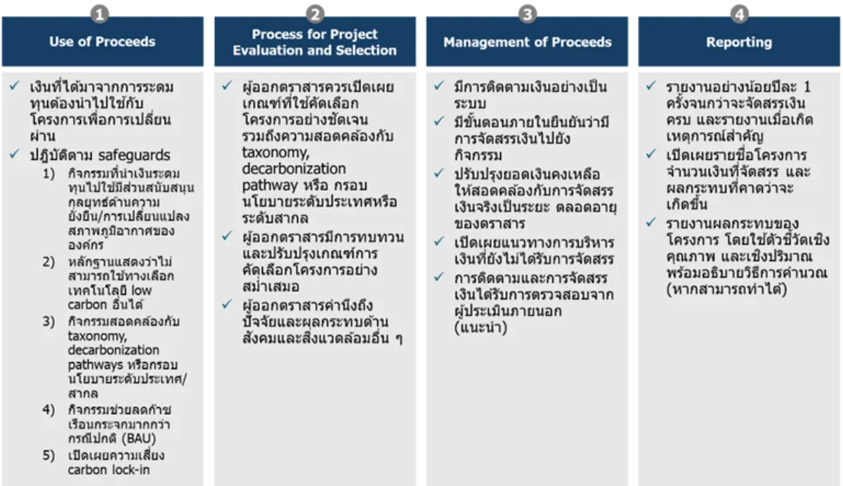- ผู้ระดมทุนปฏิบัติตามมาตรการป้องกัน (safeguards) ที่ ICMA ระบุไว้ทั้งหมด 5 ข้อเพื่อเป็นการยืนยันความน่าเชื่อถือของการดำเนินงานเพื่อการเปลี่ยนผ่าน