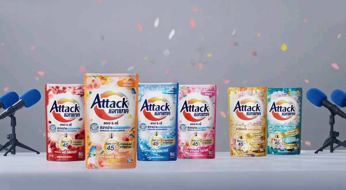 ผลิตภัณฑ์ซักผ้า “แอทแทค” ตอกย้ำการเป็นน้ำยาซักผ้าที่ “ยิ่งขยับ ยิ่งหอม” มาพร้อมเทคโนโลยีแคปซูลน้ำหอม และมีให้เลือก 4 กลิ่น ได้แก่