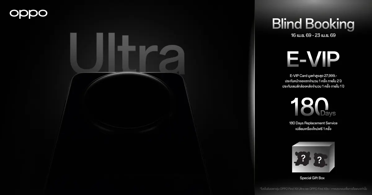 - สิทธิ์ E-VIP Card ต้องกดรับสิทธิ์ผ่านแอปพลิเคชัน MY OPPO ภายใน 1 ปี
