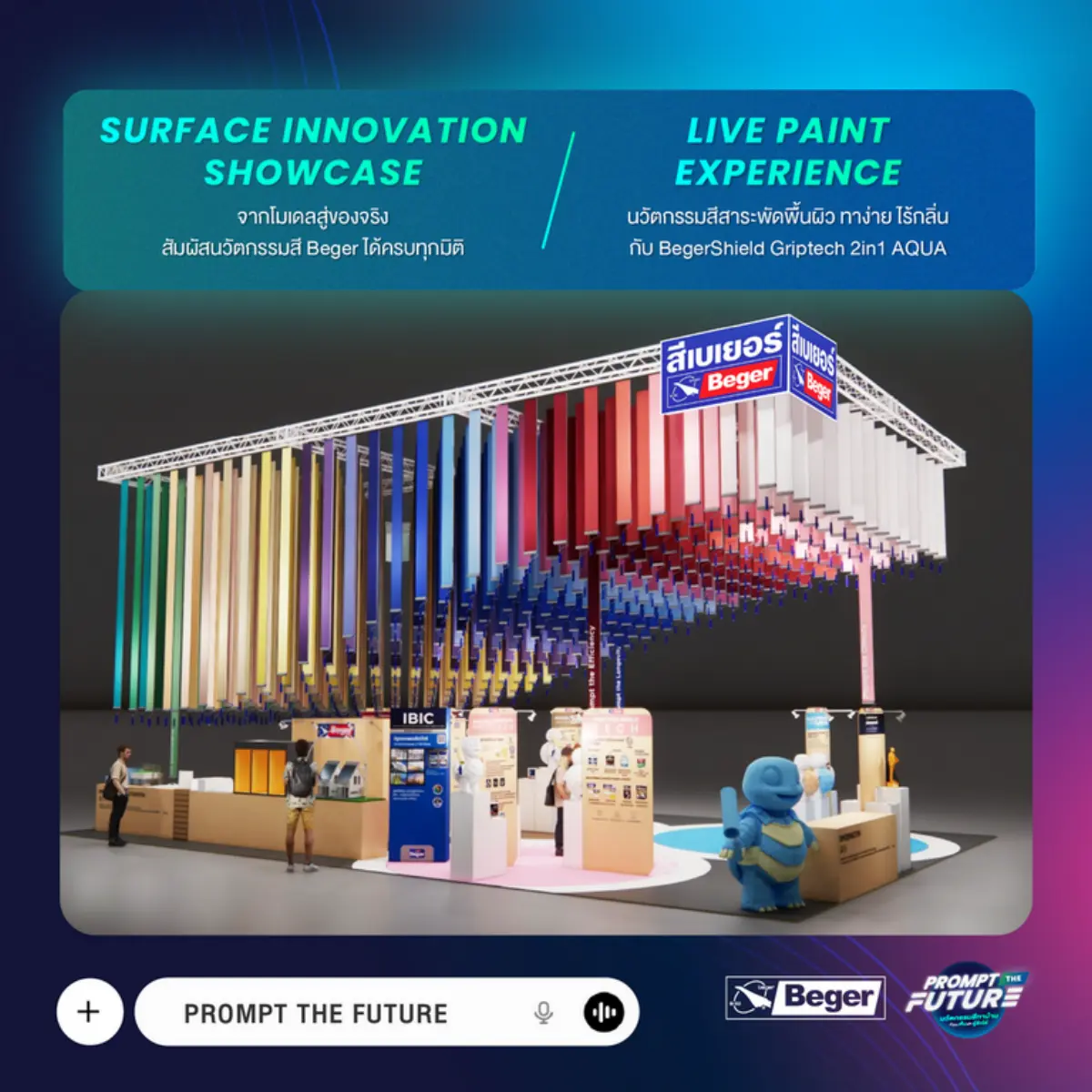 อีกหนึ่งไฮไลต์ที่โดดเด่นคือ Technical Mockup รูปแบบใหม่ ผ่านโมเดล 3 มิติ “เต่าเบเยอร์” ที่จำลองพื้นผิวจริงแบบ 360 องศา ช่วยให้ผู้เข้าชมสามารถเห็นประสิทธิภาพของระบบสีได้อย่างชัดเจนในสภาพแวดล้อมเสมือนจริง ยกระดับการนำเสนอเทคโนโลยีสู่ประสบการณ์ที่เข้าใจง่ายและจับต้องได้